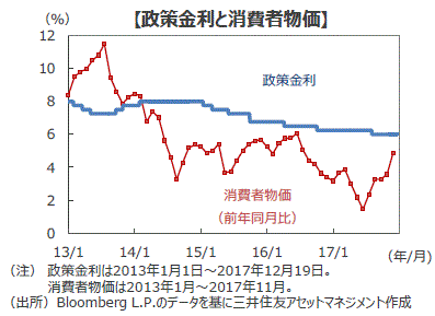 ■また、18年度のインフレ率は、景気拡大に伴い+5.5%に加速すると想定しています。金融政策は当面据え置きが見込まれますが、18年2月に発表される18年度予算案が注目されます。19年前半に予定される総選挙をにらんで財政が拡張的になるようであれば、RBIは将来の財政赤字拡大、物価上昇を警戒し、金融政策を引き締め姿勢に転換する可能性があります。