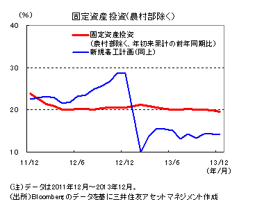 特に1-12月累計の固定資産投資が前年同期比+19.6%と緩やかな鈍化を続けました。先行きの参考となる新規着工計画も同+14.2%と、加速感は見られず、緩やかな鈍化を続ける格好となりました。