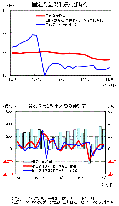 GDP成長率が年後半に失速する可能性は総じて低下しており、2014年通年の目標である「+7.5%前後」の成長は達成されそうです。なお、現地報道では中国政府が4月~6月に政府系銀行へ1兆元規模(約16.3兆円)の大型の資金供給を行ったと伝えられています。これは、主に都市部の貧困地区の再開発などに向けた資金供給と指摘されており、その規模からも、経済の拡大基調を維持することに寄与しそうです。加えて、中国政府には、財政支出の拡大や規制緩和、金融政策の緩和方向への調整など、支援策の拡充を続ける余地があると見られ、景気鈍化への懸念は抑えられそうです。