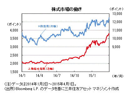 ■上昇の背景は、政策期待の高まりです。3月に開催された全国人民代表大会(全人代)で構造改革を一層進める方針が決定され、追加金融緩和や財政支出の拡大、成長戦略への期待が高まっています。