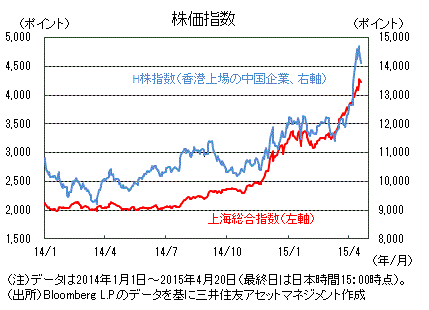 ■中国の株価指数(上海総合指数、H株指数)は、4月20日(日本時間の15:00時点)で、それぞれ、年初来約31%、約18%上昇しています。足元の上昇ペースが速いことへの警戒感は残りますが、構造改革の進展による中期的な企業の競争力向上に加えて、追加金融緩和期待が当面は株式市場を支えると見られます。