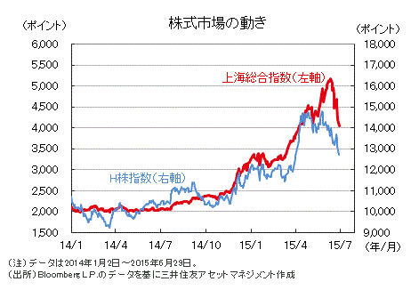 ■本土株式市場は、当面振幅の大きい不安定な値動きを繰り返しつつ、下値を模索する展開となりそうです。信用取引にからむ返済資金確保のための売り圧力も懸念されます。一方、機関投資家がグローバルに投資する香港市場では、本土市場に連れた動きが想定され、またギリシャ問題などの影響も受けやすいと見られます。