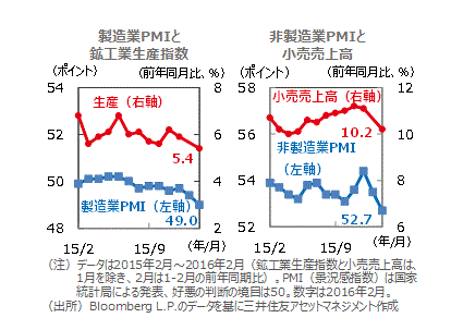 ■2月の非製造業PMIも、1月から低下しました。1-2月の小売売上高も前年比の伸びが縮小しました。春節休暇中の消費が期待されたほどではなく、製造業の低迷が影響したと見られます。
