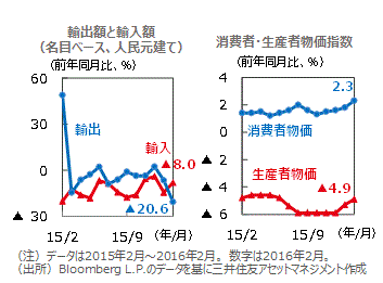 ■2月の消費者物価は、天候要因による食料品価格の上昇を受け、前年比で上昇が加速しました。また、原油や資源価格が反発し、生産者物価も前年比のマイナス幅が縮小しました。しかし、過剰生産能力の削減による物価下落圧力が大きく、物価は上昇しづらい状況が続きそうです。