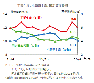 ■最近発表された4月の各種景気指標は、減速を示すものが目立ちます。4月の工業生産、小売売上高、固定資産投資の前年同期比は、いずれも3月から伸び率が鈍化し、市場予想(ブルームバーグ集計)を下回りました。