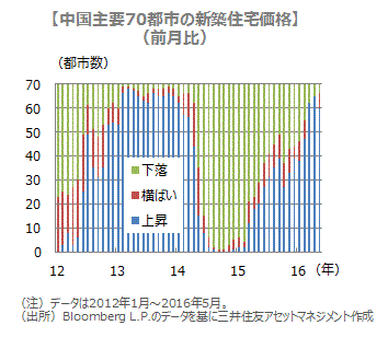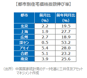 ■国家統計局は主要70都市を3分類(1級:北京、上海、広州、深セン、2級:省都など31都市、3級:その他35都市)しています。1級の北京、上海、深センは市当局の住宅ローン規制などで価格上昇が緩やかになりましたが、あふれたマネーが周辺都市に流れ込み、アモイ、合肥などの2級地方中核都市では前月比で約5%の値上がりが続き、過熱感が出ています。一方、前月より価格が下落した4都市は、すべて3級都市でした。一部の3級地方都市では、住宅在庫の圧縮が難しい状況で、2極化が著しくなっています。