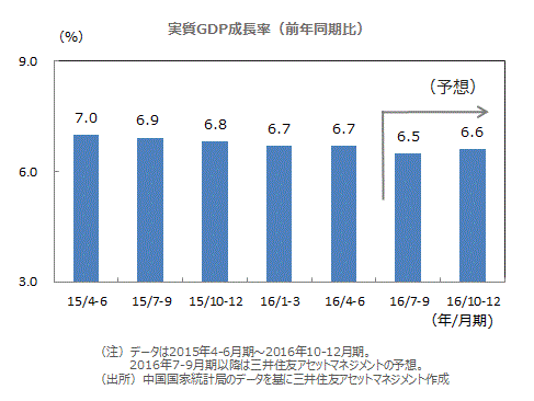 ■中国国家統計局が発表した16年4~6月期の国内総生産(GDP)は、物価変動を除く実質で前年同期比+6.7%でした。習近平指導部の16年の目標である「6.5~7.0%」の範囲内であり、市場予想(ブルームバーグ集計、6.6%)をわずかに上回りました。