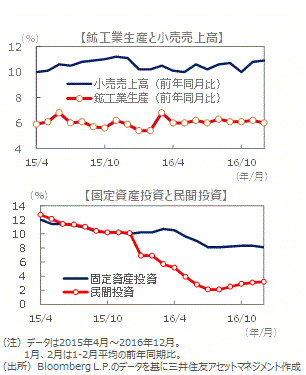 ■良好な雇用環境を背景とした個人消費の堅調な拡大、民間投資の持ち直しなどから、17年も前年比+6%台後半の安定した成長が続く見込みです。ただし、米国第一主義を掲げるトランプ新政権の貿易政策には、注意を払っておく必要がありそうです。