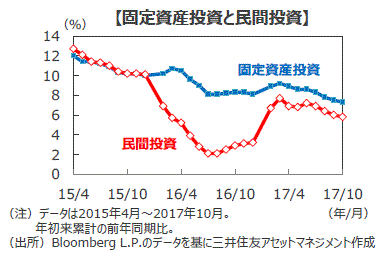 ■17年1~10月の固定資産投資は前年同期比+7.3%と、1~9月(同+7.5%)から伸び率が小幅に鈍化しました。民間投資がやや減速した一方、インフラ投資の伸びはほぼ横ばいでした。