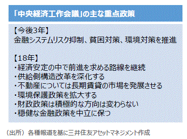 ■また、経済の質の向上に向け、今後3年間で金融システムリスクの抑制、貧困対策、環境対策を進める中期方針が確認されました。18年の重点政策としては、ゾンビ企業を淘汰し、イノベーションを持つ企業を育成する構造改革や不動産価格安定に向けた住宅長期貸付導入などが示されました。