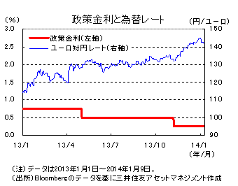 今回のECBの決定は市場予想に沿ったものであったため、金融市場への影響は限定的でした。ユーロ圏では、12月の製造業PMIが52.7ポイントと、3カ月連続で上昇するなど景況感が改善傾向にあります。特に、ユーロ圏の経済をけん引するドイツでは、11月の製造業受注が前月比+2.1%と、市場予想(ブルームバーグ集計)の同+1.5%を上回るなど、景気の回復に少しずつ勢いが出てきました。2014年のユーロ圏の経済は、ドイツを中心とした域内の内需や、米国向け輸出を中心とした外需が成長のドライバーとなり、緩やかな回復が続くと見込まれます。