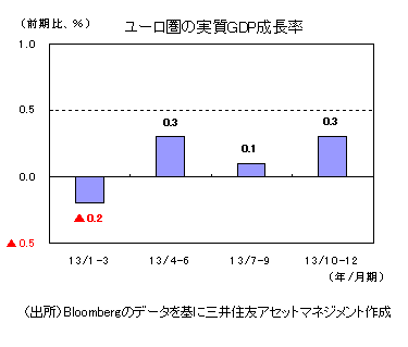 ユーロ圏の2013年10-12月期の実質GDP成長率は前期比+0.3%と、3四半期連続のプラス成長となりました。市場予想(ブルームバーグ集計)の同+0.2%も小幅に上回りました。