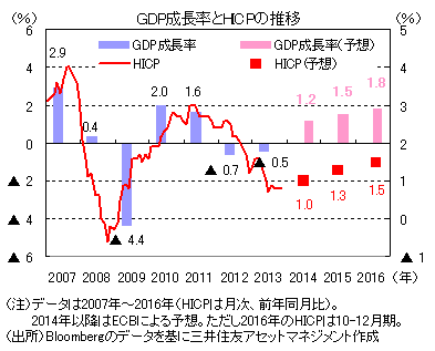 また、消費者物価(HICP)見通しは、2014年は前年比+1.0%、2015年は同+1.3%、2016年は同+1.5%と示され、前回から若干下方修正されました。ただし2016年10-12月期には同+1.7%となると予想されており、中期的にはECBの目標とする2%以下かつ2%近くの水準まで徐々に上昇するとのこれまでの見方に沿った予想が示されました。