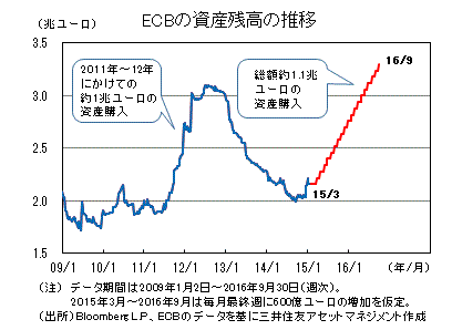 ■欧州中央銀行(ECB)は22日、月600億ユーロの国債、欧州機関債などの購入を、少なくとも2016年9月まで継続する量的金融緩和を決定しました。この期間の資産購入総額は1兆ユーロを超えます。また、政策金利、預金金利は、それぞれ0.05%、マイナス0.20%に据え置くことを決定しました。なお、ギリシャなどの重債務国の国債も条件付きで購入対象となりました。