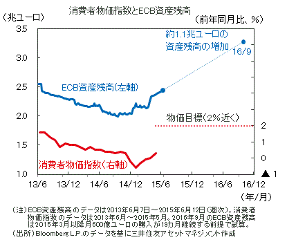 ■5月の消費者物価指数は前年同月比+0.3%と今年1月の同▲0.6%を直近の底として上昇しています。ユーロ安から食料品価格などが上昇し、原油安の影響も和らいできたことが要因です。デフレ懸念は後退しています。