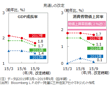 ■ドイツ国債の利回りは、金融緩和の強化も期待され、低位での推移が見込まれます。為替市場では、米国の年内利上げ観測から、ユーロは対米ドルで軟調に推移すると見込まれます。株式市場では、金融緩和強化への期待や、堅調な企業業績を背景として、底堅い展開が予想されます。