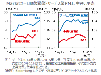 ■11月の小売は、パリ同時多発テロによるフランスの低下などが影響し、前月から低下しましたが、全体としては比較的高い水準です。12月のMarkitユーロ圏サービス業PMIは前月から横ばいで総じて底堅く、サービス業が景気回復を支えています。