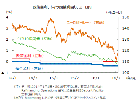 ■欧州中央銀行(ECB)は21日の理事会で、政策金利、預金金利(金融機関がECBに余剰資金を預け入れた際に適用する金利)を、それぞれ0.00%、▲0.40%に据え置き、量的緩和の規模を維持することを決定しました。英国の欧州連合(EU)離脱選択後初めての理事会であり、追加緩和があるかが注目されましたが、現状の金融政策が維持されました。