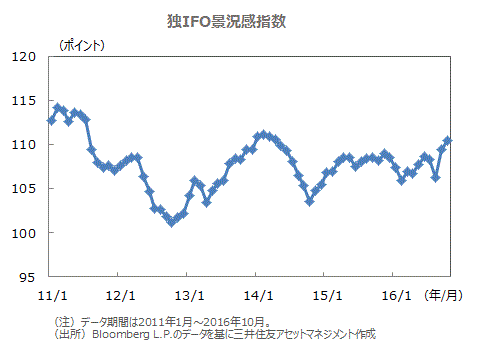 ■ドイツのIFO経済研究所が発表した10月の独IFO景況感指数は110.5となり、市場予想(109.6、ブルームバーグ)を上回りました。今後6カ月の景況感を示す期待指数も引き続き上昇しており、ユーロ圏で最大規模を誇るドイツ景気の拡大が当面続くことを示唆しています。