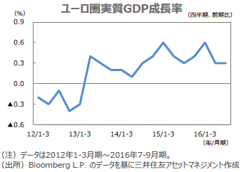 ■2016年7-9月期のユーロ圏の実質GDP成長率(速報値)は前期比+0.3%と、4-6月期と同水準の伸びとなりました。前期と同様に内需、特に個人消費の成長が続いたと見られます。英国のEU離脱選択が景気見通しの下振れリスクとして意識されていましたが、今のところ域内経済への影響は限定的と見られます。
