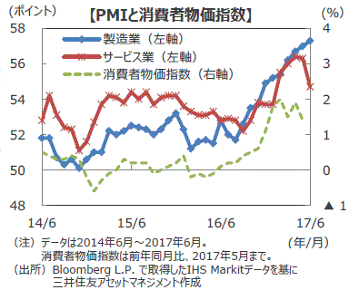 ■6月のユーロ圏の製造業PMI(速報値)は57.3、サービス業PMIは54.7といずれも中立水準を上回る良好な水準を維持しています。