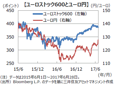 ■景気回復および景況感の改善を背景としてユーロ圏企業の業績は底入れから回復へと向かっています。また、今年に入り主要各国で総選挙、大統領選挙などの重要な政治イベントが続きましたが、これらを波乱なくこなしたことで、足元では金融市場に安心感が広がっています。こうしたことから、⽶国と比べて相対的に割安感がある欧州の株式市場は、引き続き堅調に推移すると見られます。通貨ユーロはECBによる金融緩和の縮小観測が下支え要因となり、底堅い展開が見込まれます。