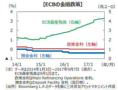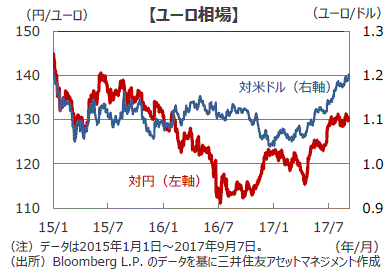 ■ECBの見通しは、成長率については17年が1.9%から2.2%と上方修正されましたが、18年以降は据え置かれました。物価については、ユーロ高を反映し、17年が1.5%、18年が1.2%、19年が1.5%と、18年以降が小幅に下方修正されました。ECBは最近のユーロ高の主因を内需の強さと分析し、堅調な内需を背景にインフレ見通しの下方修正を小幅にとどめました。