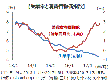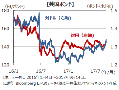 ■足元の英国景気は概ね好調です。景気の先行指標となる企業の購買担当者景況感指数は景気拡大を示す50超となっています。雇用環境も改善しており、7月の英国の失業率は4.3%と市場予想(ブルームバーグ集計)やイングランド銀行(BOE、イギリスの中央銀行)の事前予想を下回りました。これは40年ぶりの水準です。