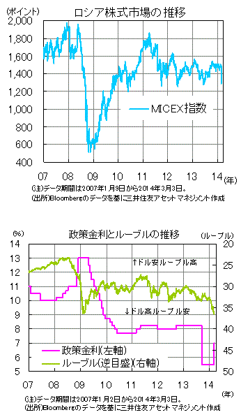 なお、ウクライナPFTS株価指数は、14年2月中旬にかけて調整した後、20日を底に大きく反騰し、27日までに+35.6%の大幅上昇を記録した後、3月3日まで同▲9.1%の調整となっています。