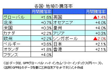 アジア地域は、シンガポールが前月比▲2.0%(円ベース、うちシンガポールドル要因は+0.1%)、香港が同+2.1%(円ベース、うち香港ドル要因は▲0.4%)、日本が同+2.1%となりました。シンガポールは、リート各社の決算は概ね好調でしたが、利益確定の売りが優勢となり下落しました。香港は、市場の時価総額の過半を占めるリンク・リートが、前年同期比+13%の増配を発表したことなどが好感され上昇しました。日本は、空室率の低下や賃料の上昇など不動産市況の改善が鮮明になったことや、配当利回りの高さが好感されて上昇しました。