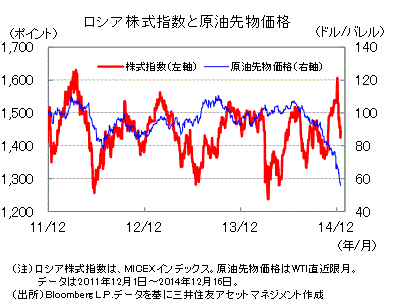 ■ロシア経済は、ウクライナ問題を巡る欧米諸国の経済制裁により状況が悪化しています。また、原油や天然ガスの輸出への依存が大きく、原油安の影響を大きく受けています。そうしたなか、エネルギーセクターが大半を占める株式市場とロシアルーブルは足元で大幅に下落しています。