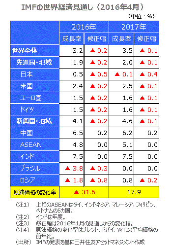 ■国際通貨基金(IMF)は4月12日、最新の世界経済見通しを発表しました。2016年の成長率は世界全体で前年比+3.2%と、前回1月時点の予測から0.2ポイント下方修正されました。