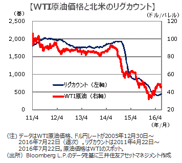 ■原油在庫が潤沢な中、6月下旬の英国のEU離脱選択以降、ドル安傾向が反転基調にあることと、これまで大幅に減少してきた北米のリグカウント(稼働中の石油掘削装置数)が、4週連続で増加に転じていることなどが背景と思われます。