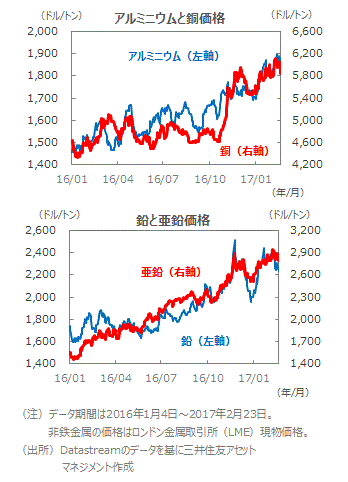 ■アルミニウムや銅といった非鉄金属の価格は、トランプ大統領の経済政策に沿って公共投資が増大するとの思惑から急騰した反動で、昨年の年末にかけて下落しましたが、その後は中国を含む世界経済の拡大期待などを背景に上昇軌道に復帰しました。