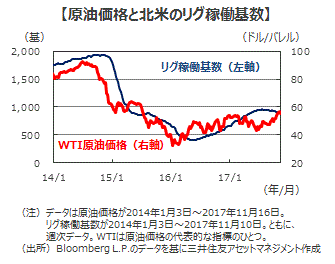 ■中期的には、需給動向が鍵となります。特に、米国での生産動向(石油の採掘・生産に使用されるリグ稼働基数の状況)、11月30日に開催が予定されているOPEC総会の内容には要注意です。OPEC総会では、来年3月に期限切れとなる協調減産の期間延長が焦点となります。
