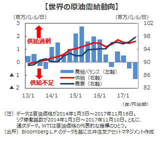 ■一方、供給量は、非OPEC産油国が17年:同6,398万バレル、18年:同6,503万バレル程度と予測されています。従って、OPECが現状の生産水準である同3,200万~3,400万バレル程度を維持すれば、需給は引き締まる見通しです。