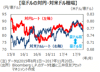■足元の豪ドルの対円相場は、80円台半ばで弱含みで推移していますが、やや長い目で見れば、①鉄鉱石や石炭等の資源価格の持ち直しが見込まれる、②豪州の貿易収支が改善しつつある、③金融政策が、日本の緩和姿勢継続に対し、豪州は中立姿勢維持の見通しである等から、堅調に推移すると予想されます。