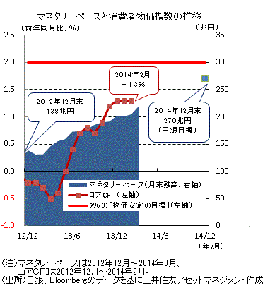 日銀は昨年1月にデフレ脱却に向けて2年程度をめどに2%の物価安定の目標を掲げました。その施策としてマネタリーベースを2倍に、ETFやJ-REITの保有高を2倍にする異次元緩和が進められています。日銀が2日に発表した3月末のマネタリーベース(市中の現金と金融機関の手元資金を示す日銀当座預金残高の合計)の残高は220兆円と過去最高を更新し、目標としている2014年末の残高270兆円に向けて順調に増加しています。これに伴い、消費者物価指数(生鮮食品を除く、以下コアCPI)は2013年6月以降プラス基調が続いています。