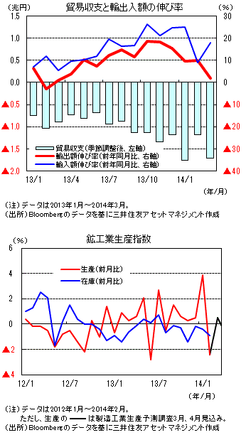 輸出の伸びが2013年12月以降、鈍化していることはやや懸念材料です。しかし米国を中心に世界的に景気は回復傾向にあることから、今後輸出は、徐々に持ち直すと思われ、貿易赤字の拡大には徐々に歯止めがかかると思われます。