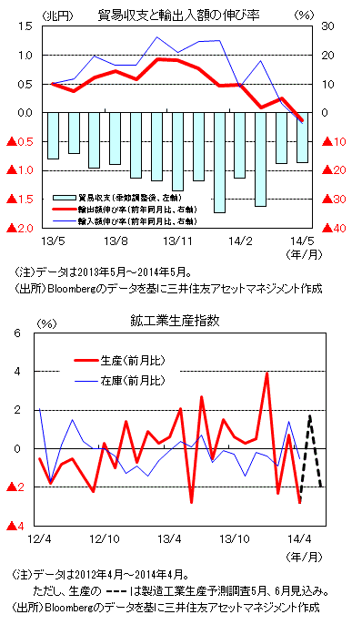 一方、輸入額も同▲3.6%と、19カ月ぶりにマイナスとなりました。4月に石油石炭税率が引き上げられことで、鉱物性燃料に前倒し需要が発生していたため、その反動減が影響しました。