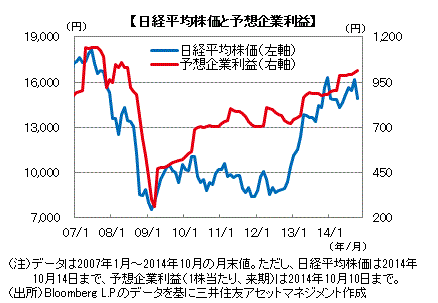 ■14日の日経平均株価は、前日比▲364.04円(同▲2.38%)の14,936.51円と大幅に下落しました。下落は5取引日連続となり、今年8月以来の15,000円割れとなりました。