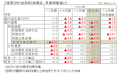 ■7-9月期の実質GDP成長率(1次速報値)は前期比年率▲1.6%と2四半期連続のマイナスとなりました。個人消費は小幅なプラスに転じたものの、4月の消費税増税の影響からの回復が緩慢で、在庫調整の影響が大きく出た形です。