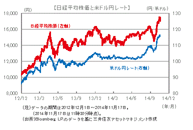 ■GDP成長率が2四半期連続でマイナスになったことで、2014年度の成長率は通年でもマイナスとなることが濃厚となりました。2014年度下期から来年度に向けては、増税延期による消費者マインドの改善、円安による企業業績の上振れ、株価上昇による資産効果などが景気回復を支えると思われます。