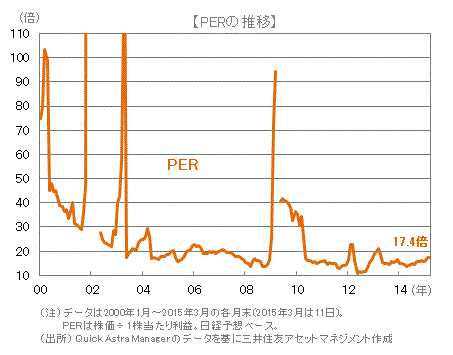 ■日経平均株価が1万9,000円台で推移した2000年頃はIT(情報技術)バブルと呼ばれた局面で、PERはおおよそ70倍から100倍でした。足元では17.4倍と、株価にバブルが発生しているわけではありません。過剰流動性の増加により変動性が増す可能性はありますが、2015年度の経常利益は過去最高益を更新すると見込まれ、業績の好調さを評価する市場環境が続くと考えられます。