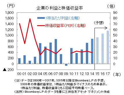 ■日本企業の収益力は、非金融企業の株主資本利益率(ROE)が徐々に上向くなど、改善傾向にあります。また、昨年後半からの円安や原油安による直接的な収益の押し上げ効果に加え、国内外の景気回復を背景に、今年の企業収益は過去最高を更新する見込みです。市場では、来年以降もさらに増益が続くと期待されています。