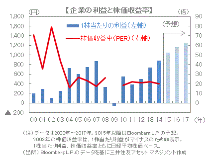 ■また、2015年の企業収益予想は、約2カ月前の前年比+5%から直近では同+19%に上向いており、過去最高を更新する見込みです。