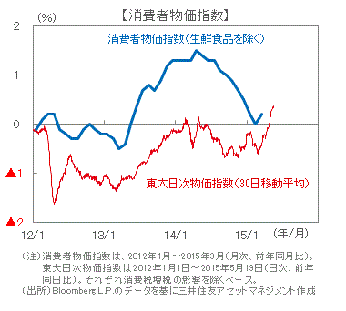 ■物価見通しは、従来の「予想物価上昇率は、やや長い目で見れば、全体として上昇している」との見方が維持されました。3月の消費者物価指数(生鮮食品を除く)上昇率は、前月までの低下傾向が反転し上向きました。足元の状況を、東大日次物価指数(30日移動平均)で見ると、4月末頃から前年比プラスに転じており、上向きの傾向が持続しています。