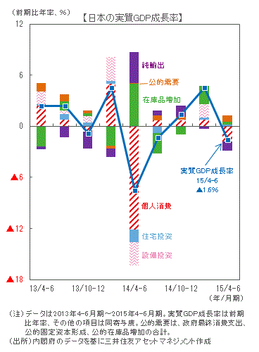 ■内閣府は17日、4-6月期のGDP統計1次速報値を発表しました。実質GDP成長率は、前期比年率▲1.6%と3四半期ぶりにマイナス成長となりました。個人消費や輸出が低迷したことなどが背景です。