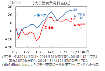 ■14日発表の11月~12月調査の「日銀短観」によると、大企業・製造業の「業況判断DI」(最近)は+12、同じく非製造業は+25といずれも前期比横ばいでした。企業業績の底堅さを背景に、足元の景況感が堅調に推移しています。一方、大企業の「先行き」の景況感は、製造業、非製造業ともに悪化の方向です。新興国の景気減速に加え、米国の利上げや地政学リスクの高まりなど外部環境の不透明感が強まっていることが背景と見られます。