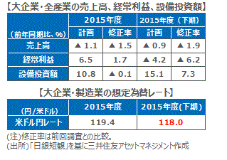 ■堅調な企業業績を背景に、設備投資計画は前回調査からほぼ変わらずの、2ケタ増が維持されました。また、製造業が事業計画の前提とする下期の米ドル円レートは118.0円と、足元の実勢よりも円高のままであり、現状の実勢レートが続けば全体として利益の上振れ要因となる見込みです。